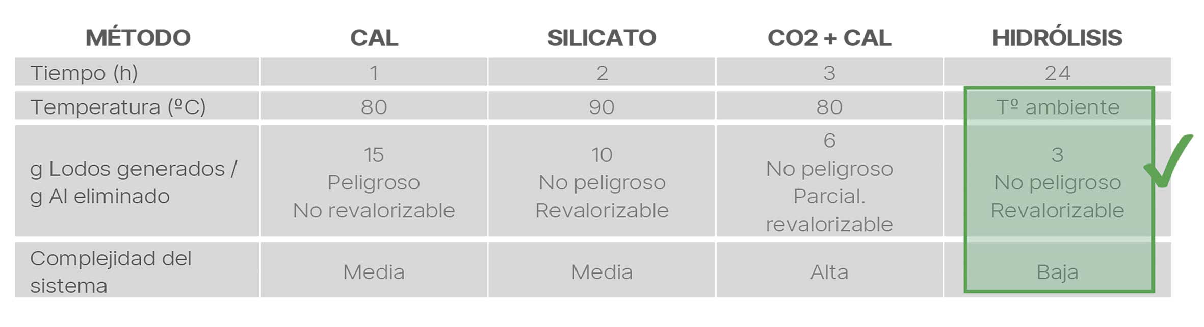 El cuarto método, basado en la hidrólisis del aluminato, se apoya en un equilibrio químico natural que permite precipitar el aluminio como alúmina pura sin añadir reactivos, operando a temperatura ambiente y con agitación constante. Esta opción es la más favorable técnica y económicamente: produce tan solo 3 g de lodo por gramo de Al eliminado, no genera residuos peligrosos y permite revalorizar la alúmina obtenida. Además, no requiere consumo continuo de reactivos, lo que la convierte en la opción más favorable desde el punto de vista económico.