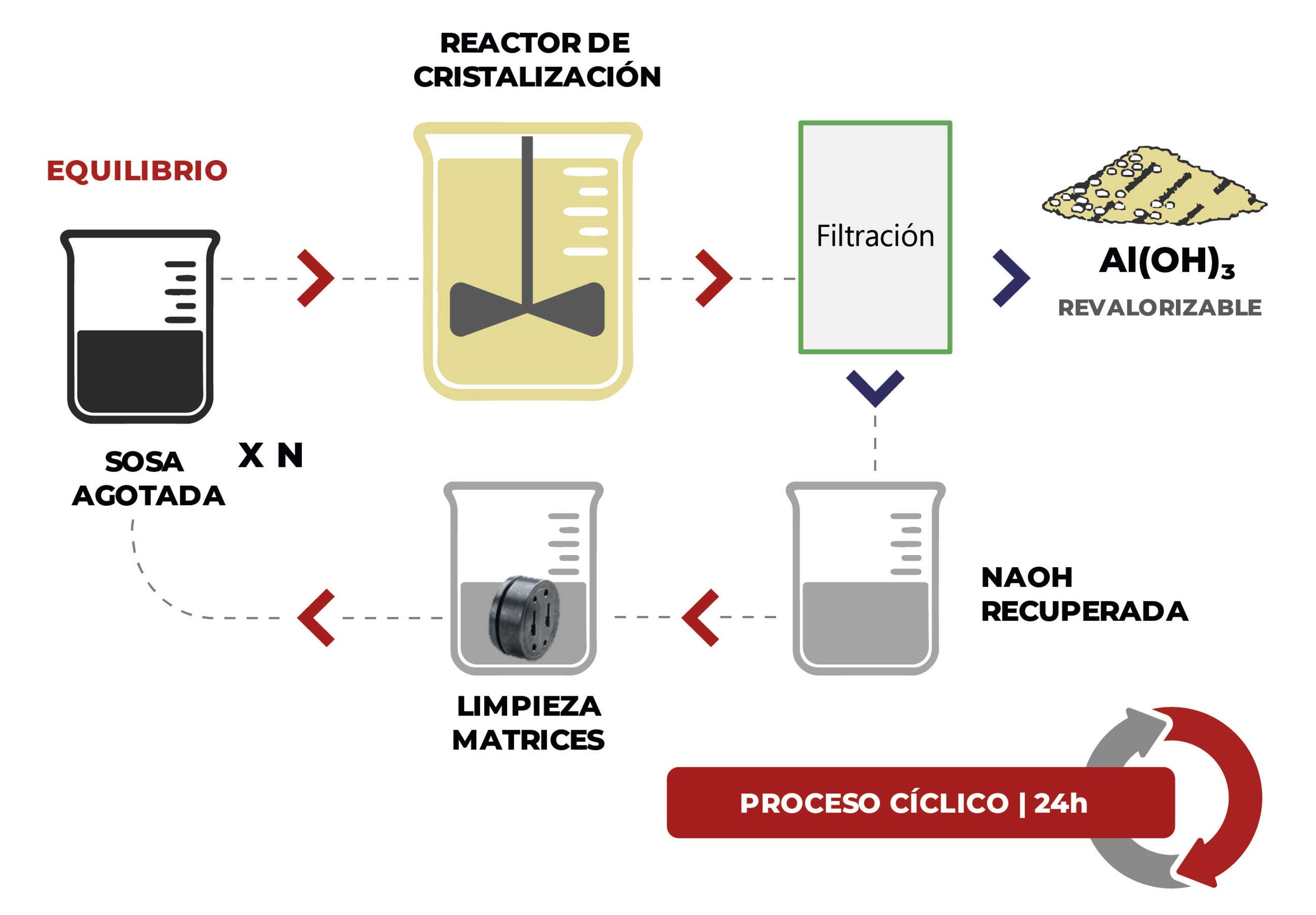 Para garantizar la calidad del producto final, es esencial mantener limpias las matrices de extrusión, eliminando el aluminio incrustado mediante baños de sosa cáustica (NaOH), que disuelven selectivamente el aluminio sin dañar el acero de la matriz. Con su uso, la concentración de aluminio disuelto (aluminato sódico) aumenta, reduciendo la eficacia y tasa de ataque del baño, que acaba considerándose agotado. Este baño agotado resulta ser un residuo catalogado como peligroso, de naturaleza altamente corrosiva, lo que conlleva un elevado coste de gestión e impacto ambiental. A modo de referencia, una planta con una producción anual de 10.000 toneladas de aluminio extruido puede generar más de 300 toneladas de este residuo, y en Europa se superan las 120.000 toneladas al año, lo que subraya la necesidad de recuperar la sosa cáustica utilizada en estos procesos. Frente a este escenario, ALSAN ha iniciado el estudio de varias estrategias tecnológicas orientadas a la recuperación de la sosa cáustica de baños agotados, con el objetivo de avanzar hacia una gestión más sostenible.