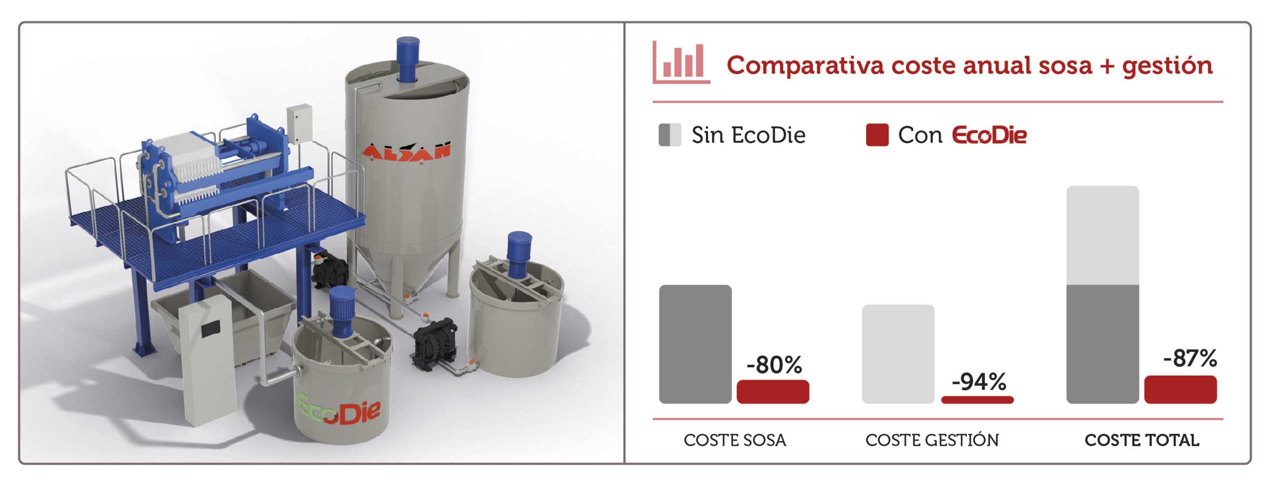 En conclusión, desde ALSAN se presenta el sistema EcoDie, diseñado para recuperar un mínimo del 80 % de la sosa cáustica utilizada en la limpieza de matrices, lo que representa un ahorro económico significativo para las plantas extrusoras, permitiendo en muchos casos amortizar rápidamente la inversión realizada. Mediante esta innovadora solución, ALSAN reafirma su compromiso con la reducción del impacto ambiental en la industria del aluminio, promoviendo la economía circular y la sostenibilidad en sus procesos.