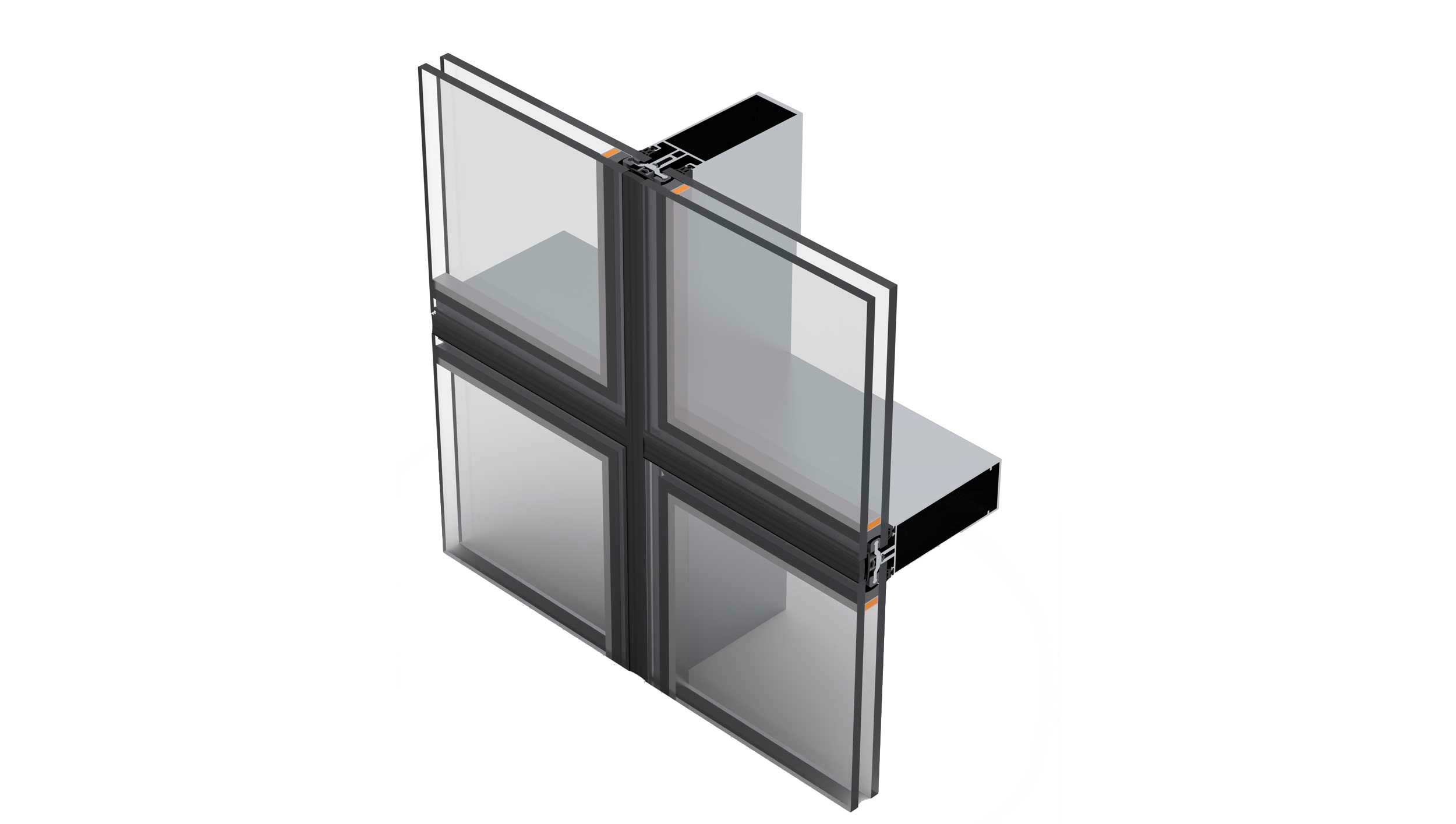 Este sistema se basa en la combinación de montantes y travesaños de solo 50 mm de sección vista interior, lo que permite obtener una fachada de estética continua y moderna. La instalación se realiza con vidrios decalados fijados mediante grapas de giro, que garantizan una sujeción segura y una superficie enrasada. La junta perimetral, sellada con silicona estructural, refuerza la imagen de continuidad y transparencia.